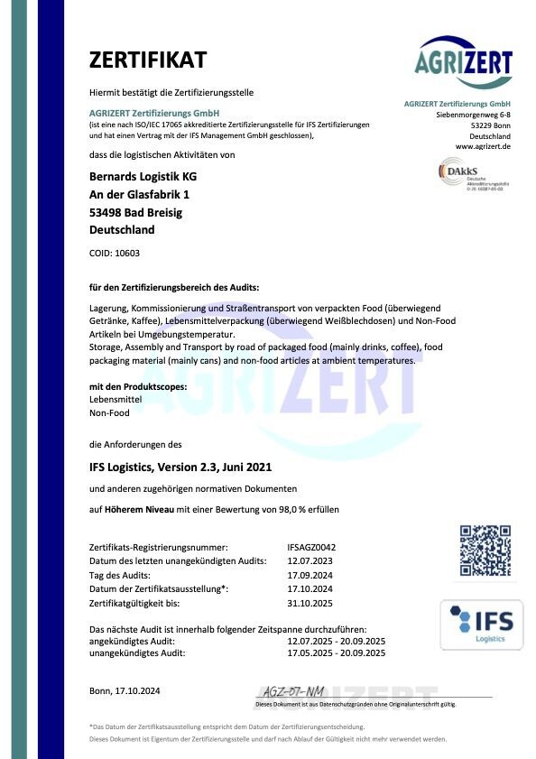 Die Bernards Logistik KG wurde 2023 zum 13. Mal in Folge erfolgreich nach dem IFS Logistics Standard zertifiziert. Unsere Zertifizierung belegt, dass wir strenge Anforderungen in den Bereichen Transport, Lagerung und Distribution erfüllen. Wir setzen höchste Maßstäbe, um sicherzustellen, dass Ihre Produkte unter optimalen Bedingungen behandelt werden.